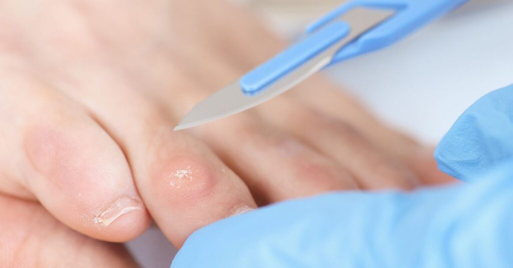 Small corn in an accessible location: corn plaster with salicylic acid or special pen to scrape off the top layer. Do not self-treat deep or hard-to-reach corns – risk of infection.