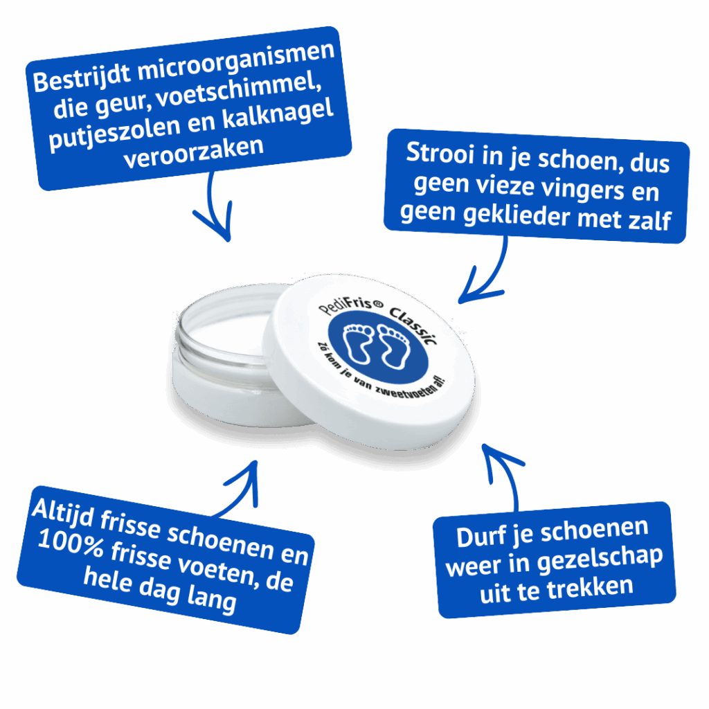 For a truly complete approach to sweaty feet and the resulting problems, combine PediSpray® with PediFris® Classic shoe powder. While PediSpray® keeps your feet dry and fresh, PediFris® Classic specifically targets the bacteria and fungi that settle in your shoes and cause odour there.