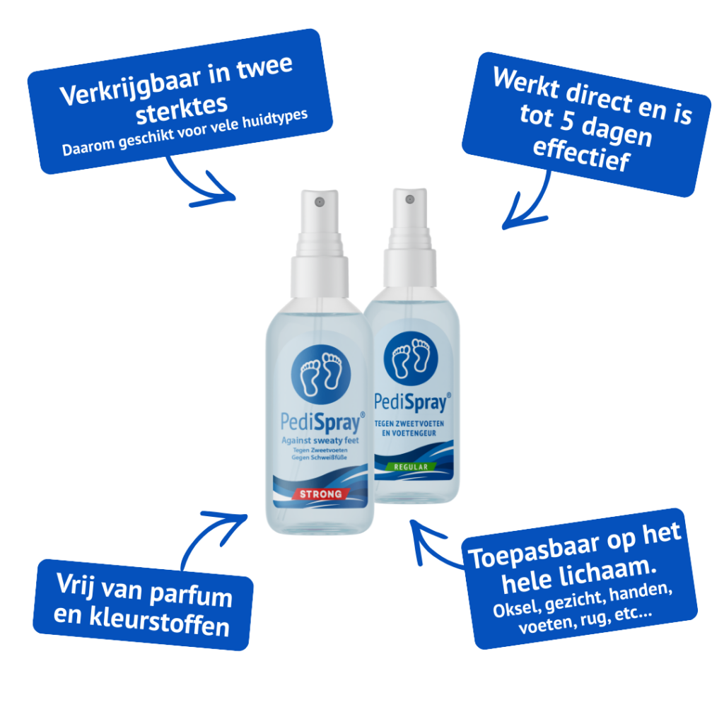 Sweaty feet create a warm, moist environment that is ideal for the growth of odour-causing bacteria. PediSpray® tackles this problem at the root by regulating sweat production. This results in dry feet, making it much harder for bacteria to multiply and preventing odour. -